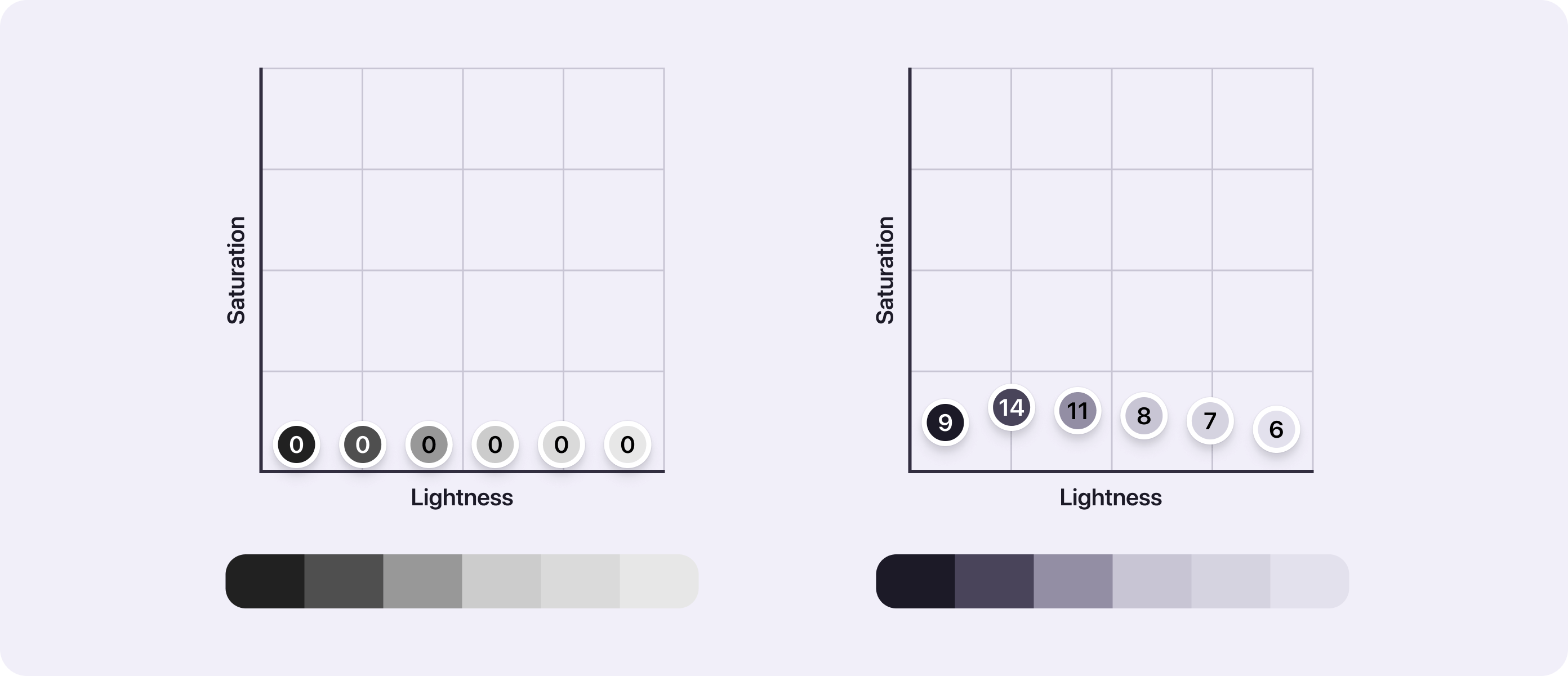 It's good to wait with choosing saturation until you have the lightness and hue values set. When choosing the saturation, there are two things to keep in mind: