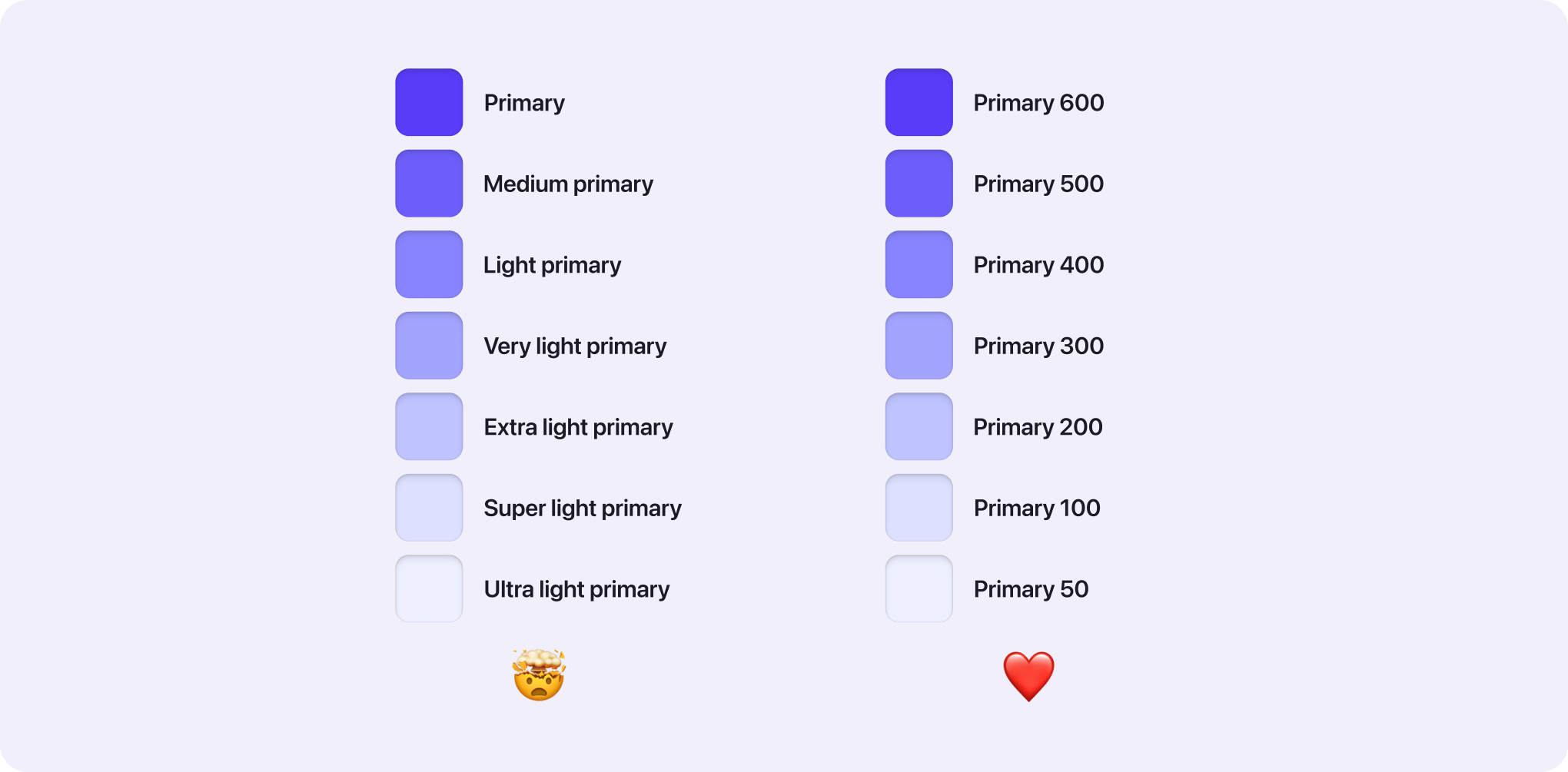 Why are numbers the best? This approach gives you the room to expand your palette without renaming existing shades. For example, if you would like to add a new shade between Primary light and Primary lighter, how would you name it? With numbers, you would have Primary 400, Primary 300, and add Primary 350.