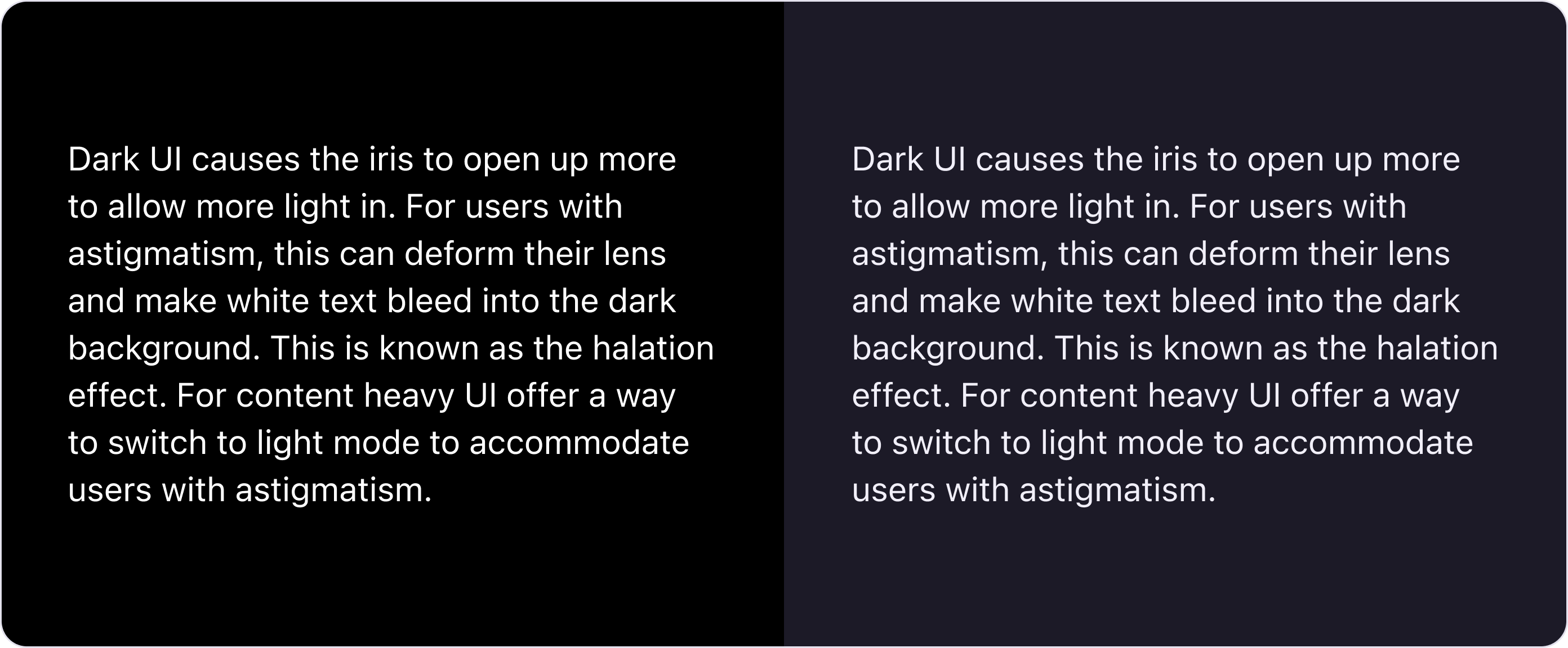 Dark UI causes the iris to open up more to allow more light in. For users with astigmatism, this can deform their lens and make white text bleed into the dark background. This is known as the halation effect. For content heavy UI offer a way to switch to light mode to accommodate users with astigmatism.