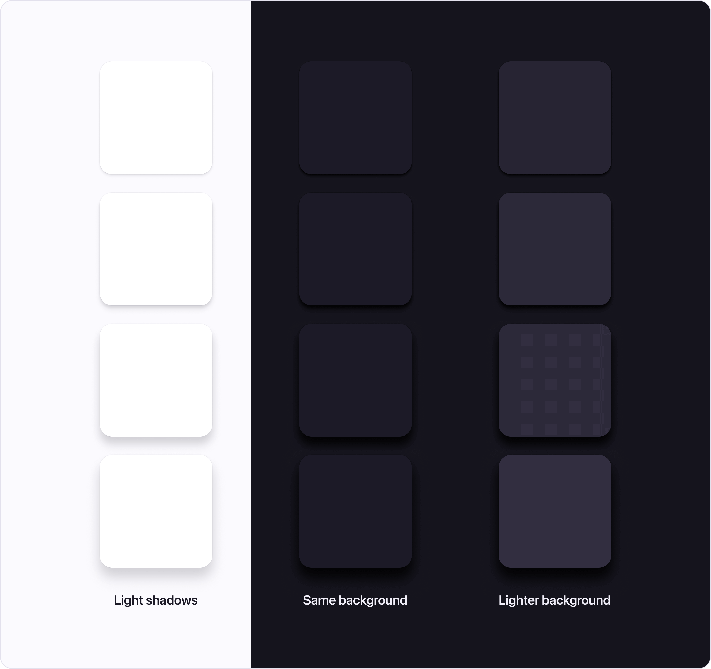 In light mode, we usually use shadows to communicate depth. The higher the surface is, the closer it is to the light source and the bigger shadow it casts. While this approach wouldn't work in a dark mode, we can use the same "light source" theory and apply it to the surface color.