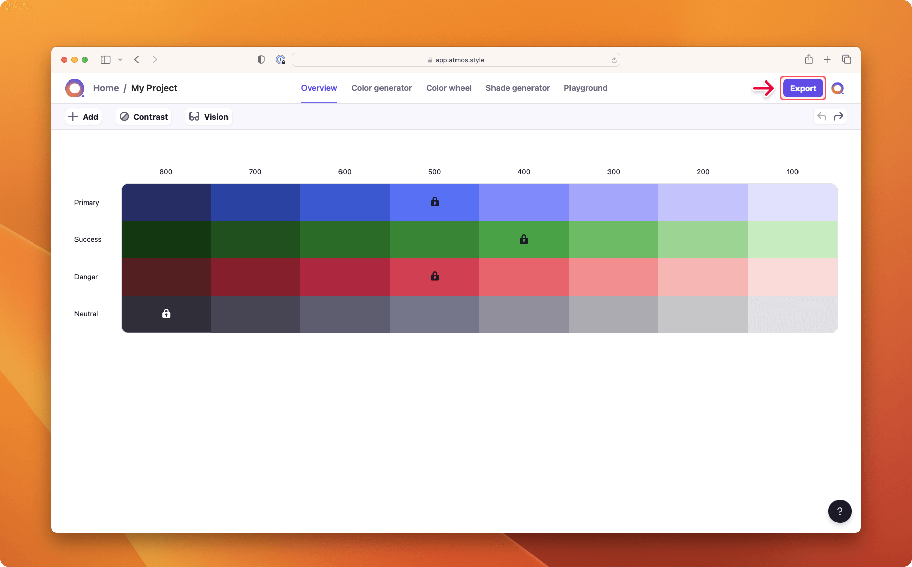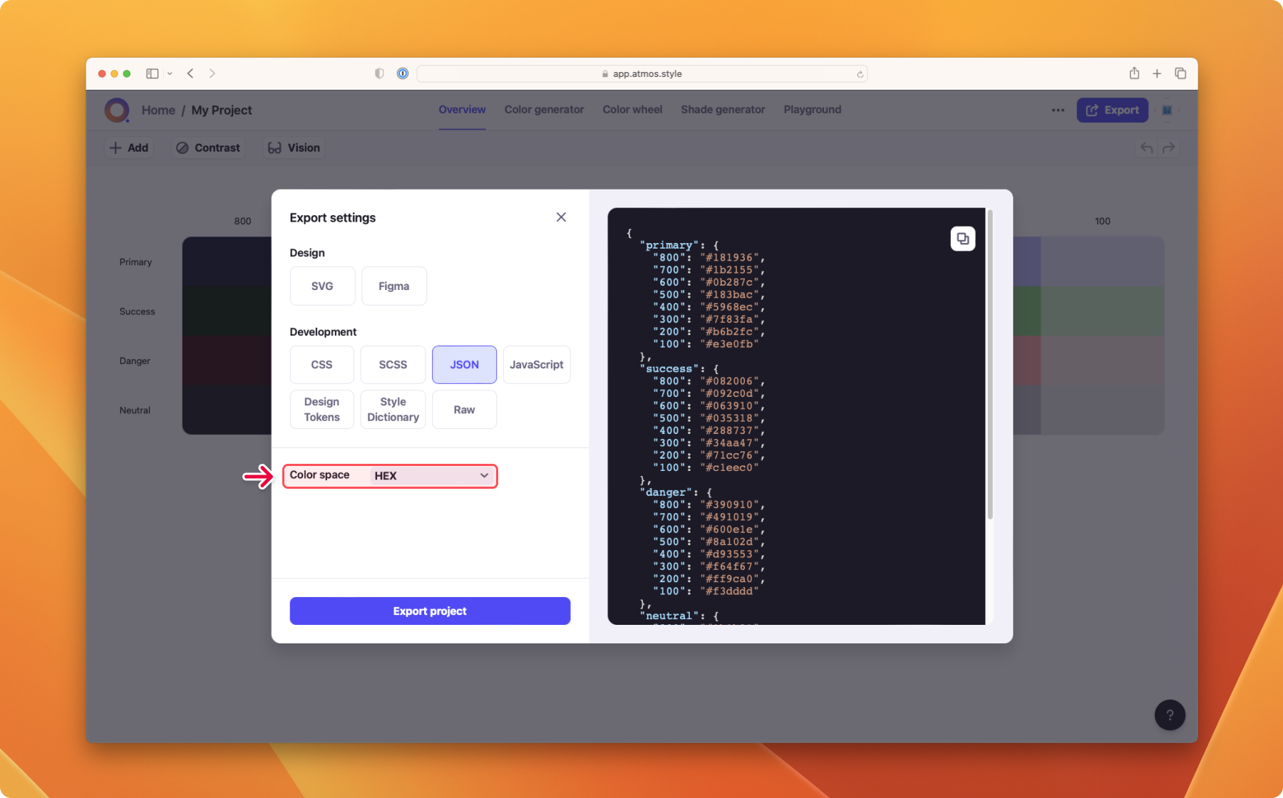 Export your palette from Atmos when you're ready to use them in other design tools or directly in code. Export settings let you customize how Atmos exports your colors.